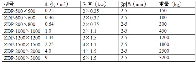 注:此表為上、下振形式振動平臺技術(shù)參數(shù),僅供參考;此外可以根據(jù)用戶實(shí)際使用需要定做臺面大小來選用振動電機(jī)數(shù)量及功率。